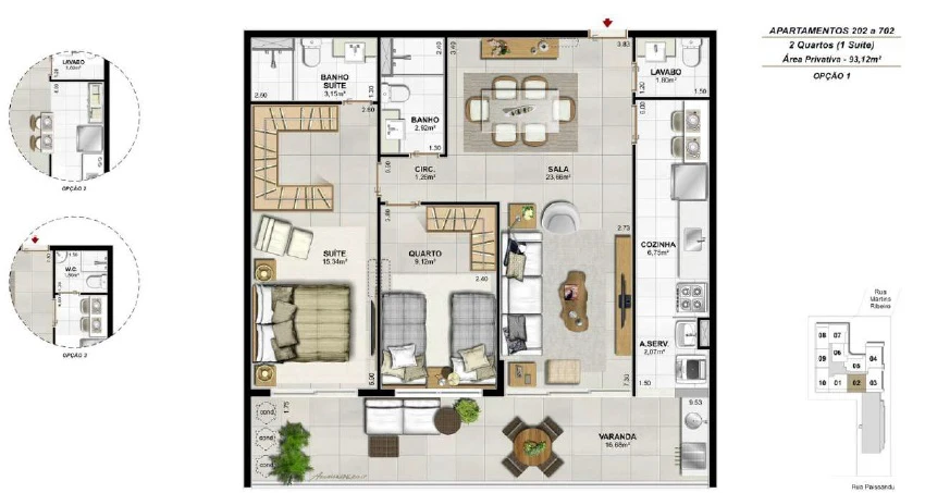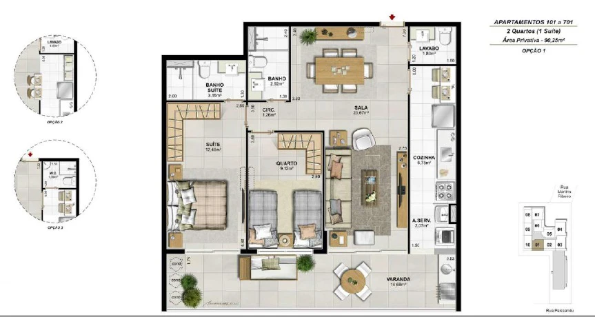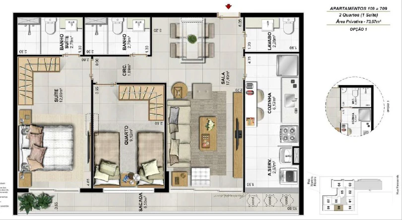 Apartamentos de 2 quartos, com 73m² até 93m²;